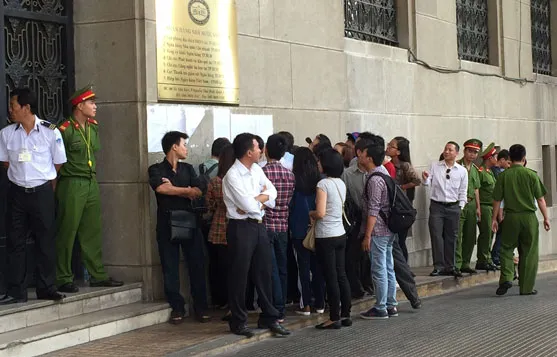Bên ngoài trụ sở NHNN chi nhánh TPHCM tại số 8 đường Võ Văn Kiệt quận 1, lực lượng công an và dân phòng được tăng cường để hỗ trợ công tác an ninh tại khu vực giao dịch.