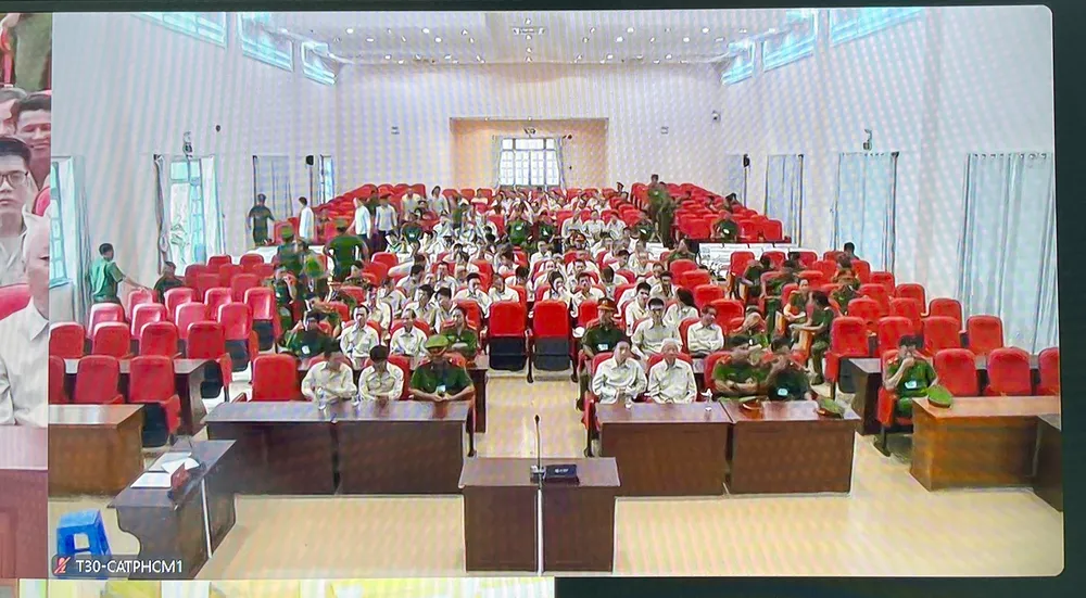 Các bị cáo tham dự phiên tòa tại điểm cầu T30. Ảnh: HOÀNG HÙNG