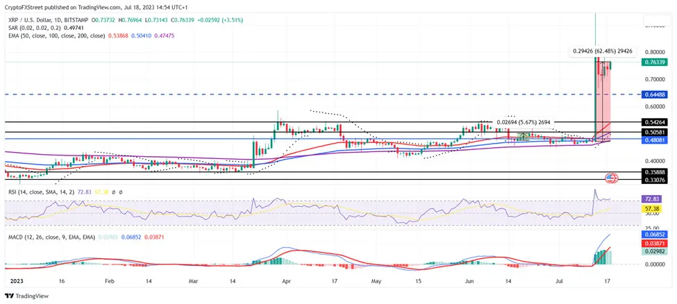 Điều này cũng được phản ánh trong hành động giá vì giá XRP vẫn tăng gần 3% trong 24 giờ qua, ngay cả khi giá Bitcoin giảm xuống dưới 30.000 USD. Mặc dù đã điều chỉnh gần 12% ngay sau đợt tăng 73%, nhưng altcoin này vẫn đang ghi nhận xu hướng tăng, xu hướng này chắc chắn sẽ sớm chậm lại.
