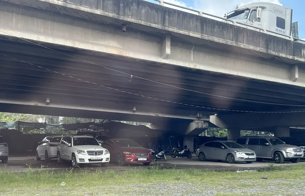 Bãi giữ xe ở gầm cầu Ông Lớn, đường Nguyễn Văn Linh, xã Bình Hưng. Ảnh: QUỐC HÙNG
