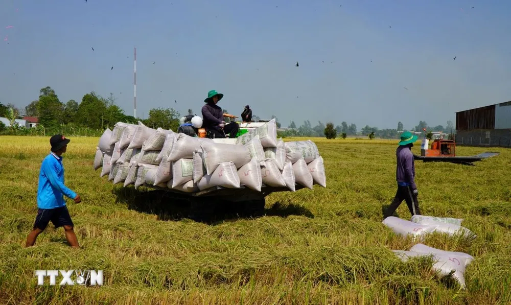 Nông dân Đồng Tháp thu hoạch vụ lúa. (Ảnh: Nhựt An/TTXVN)