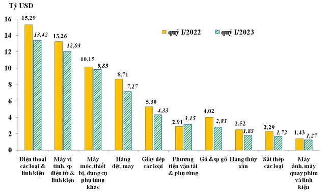 Trị giá xuất khẩu của một số nhóm hàng lớn trong quý 1/2022 và quý 1/2023. Nguồn: Tổng cục Hải quan
