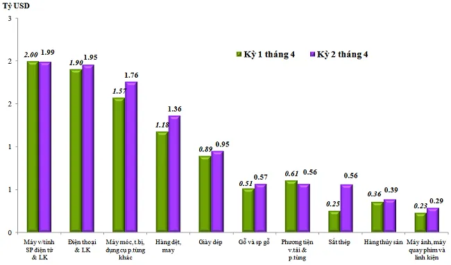 Cụ thể về xuất khẩu, trong kỳ 2 tháng 4/2023 đạt 14,55 tỷ USD, tăng 9,9% (tương ứng tăng 1,3 tỷ USD về số tuyệt đối) so với kỳ 1 tháng 4/2023. Trong đó, một số nhóm hàng có trị giá tăng mạnh, gồm: Sắt thép các loại tăng 310 triệu USD, (tương ứng tăng 123,2%); máy móc, thiết bị, dụng cụ và phụ tùng khác tăng 190 triệu USD (tương ứng tăng 12,1%); hàng dệt may tăng 184 triệu USD (tương ứng tăng 15,6%)...