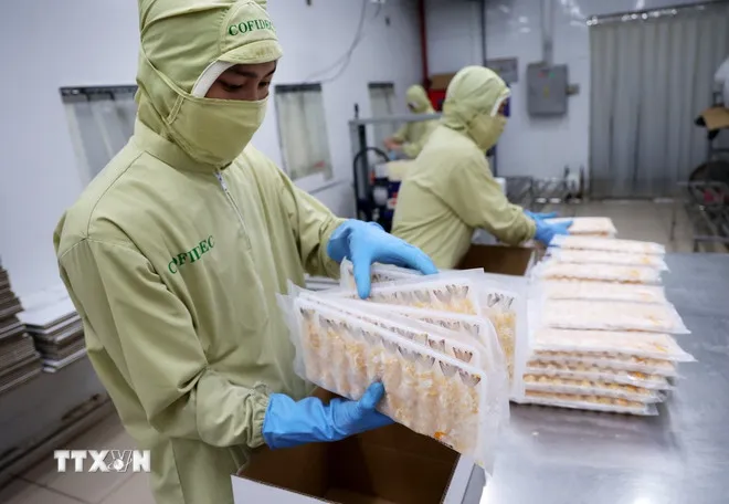 Đóng gói sản phẩm tôm chế biến xuất khẩu. (Ảnh: Hồng Đạt/TTXVN)