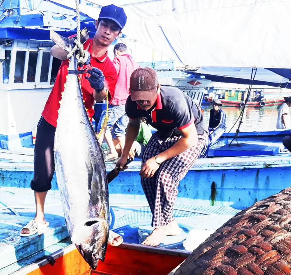 Ngư dân Bình Định đưa cá ngừ đại dương vào bờ. Ảnh: NGỌC OAI