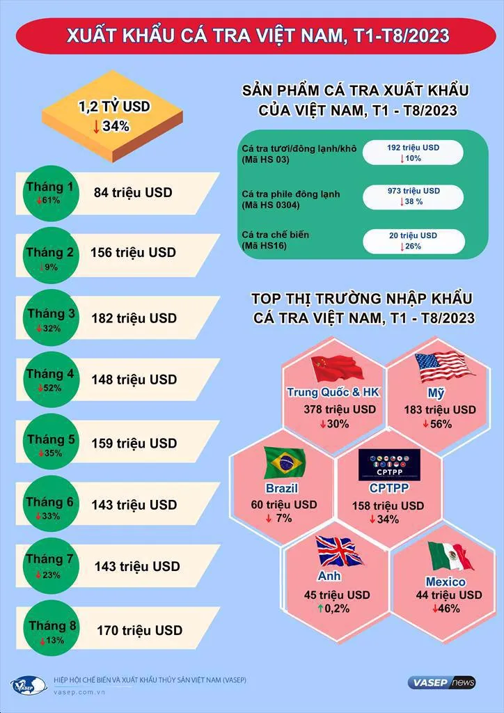 Theo Hiệp hội Chế biến và Xuất khẩu thủy sản Việt Nam (VASEP), kim ngạch xuất khẩu cá tra tháng 8/2023 đạt 170 triệu USD, giảm 13% so với cùng kỳ năm 2022. Tuy nhiên, mức giảm trong tháng 8 đã thu hẹp so với các tháng trước đó (các tháng 5,6,7 ghi nhận giảm 23-36%). Tính chung 8 tháng năm 2023, xuất khẩu cá tra Việt Nam sang các thị trường đạt gần 1,2 tỷ USD, giảm 34% so với cùng kỳ năm 2022.