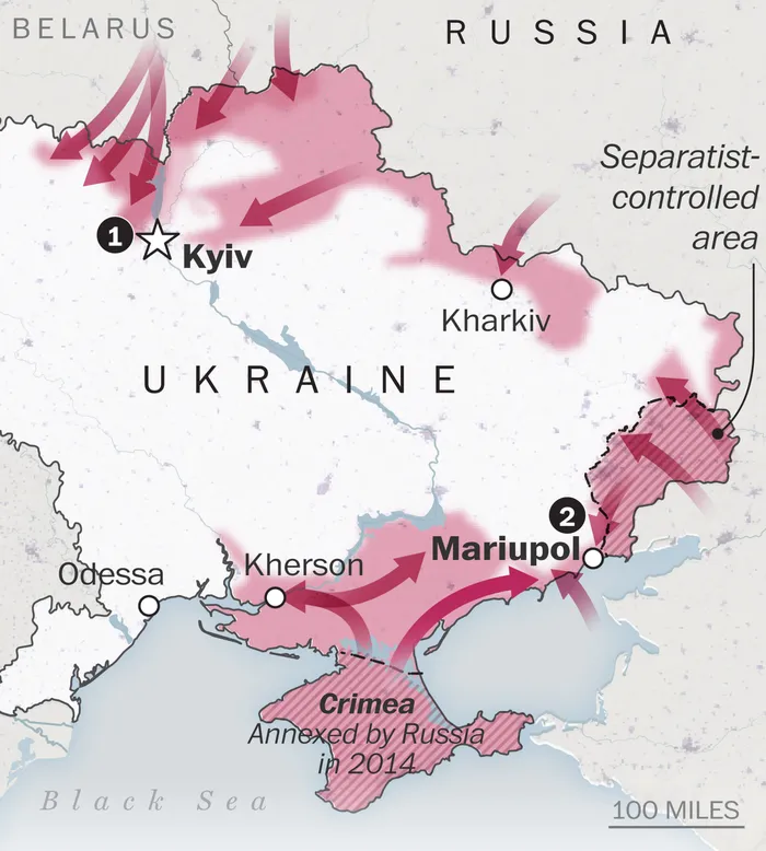 Các mũi tấn công của quân đội Nga trong ngày đầu tiên chiến dịch quân sự đặt biệt. (Ảnh: Washington Post)