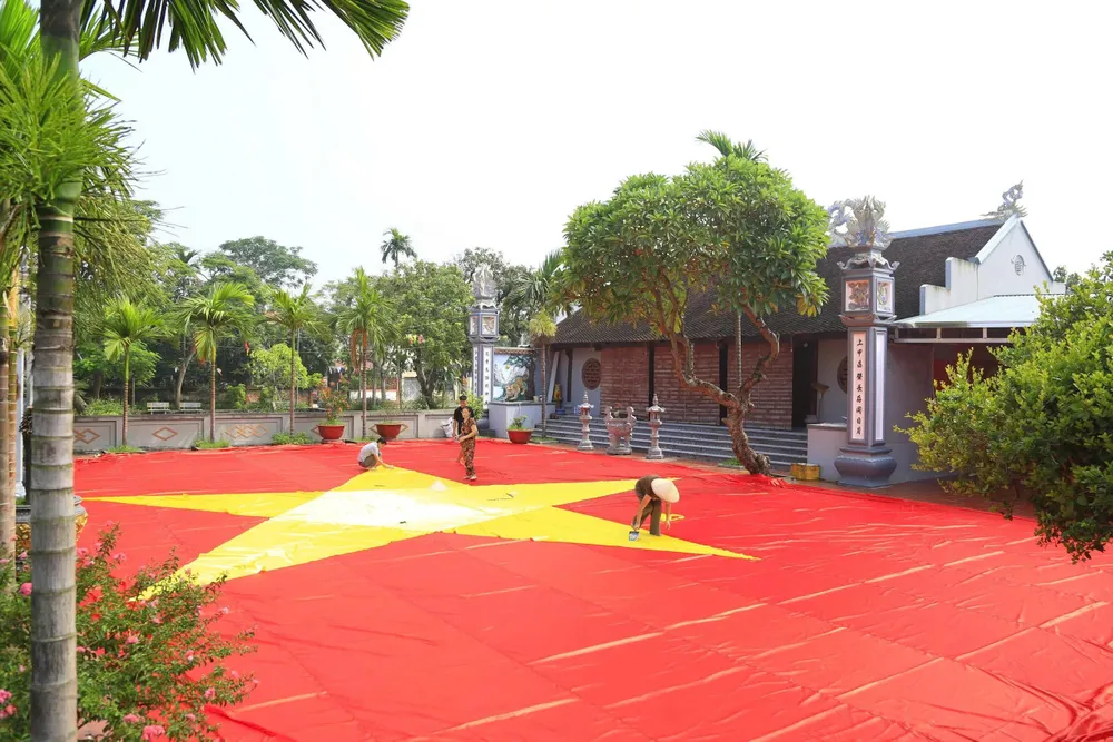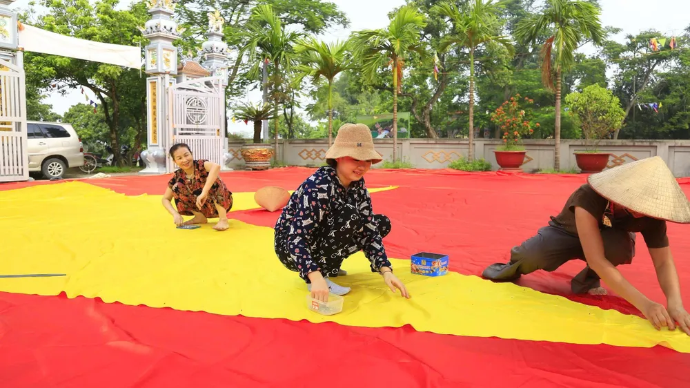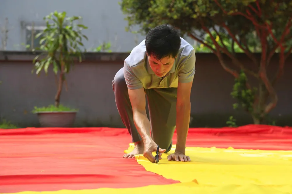 Lá cờ Tổ quốc khổng lồ đang được gấp rút hoàn thiện. Ảnh: HÀ NGUYỄN