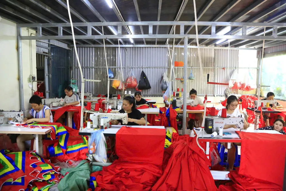 Hiện xưởng của anh Trung đang sản xuất lá cờ Tổ quốc với diện tích 600 mét vuông cho đơn vị tổ chức sự kiện dịp Lễ Quốc khánh 2-9. Càng gần đến dịp lễ lớn, các xưởng may, thêu cờ càng tất bật, góp phần lan tỏa hình ảnh thiêng liêng của lá cờ đỏ sao vàng trên mọi miền Tổ quốc.