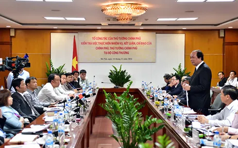 Làm việc với lãnh đạo Bộ Công Thương sáng 14/11 về tình hình triển khai thực hiện các nhiệm vụ do Chính phủ, Thủ tướng Chính phủ giao, ông Mai Tiến Dũng, Bộ trưởng, Chủ nhiệm Văn phòng Chính phủ - Tổ trưởng Tổ công tác của Thủ tướng truyền đạt ý kiến của Thủ tướng yêu cầu Bộ Công Thương làm rõ 8 vấn đề.